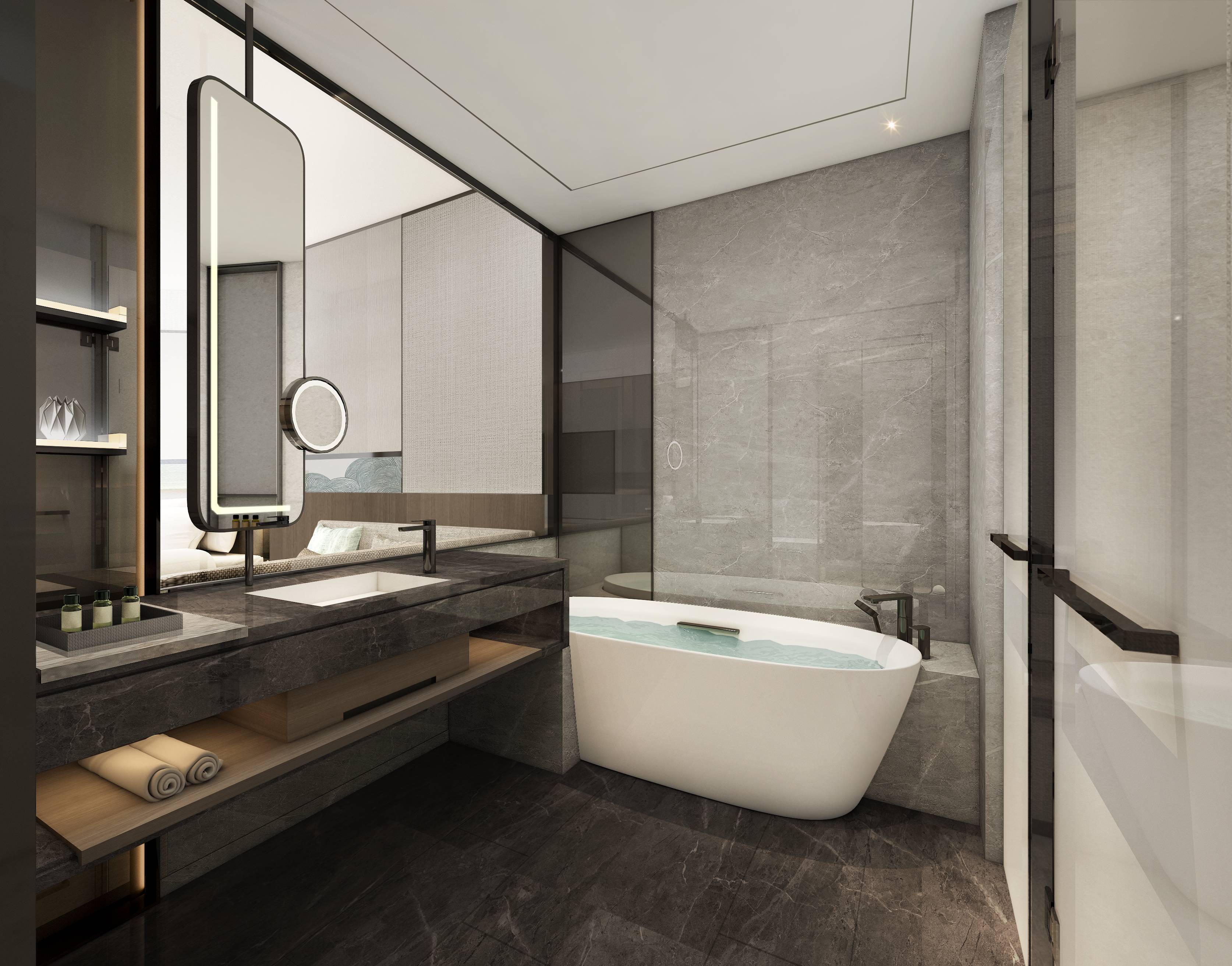晨起,拉開窗簾,全景落地窗將這座科技金融之城的勃勃生機盡收眼底,現(xiàn)代與典雅相融合。