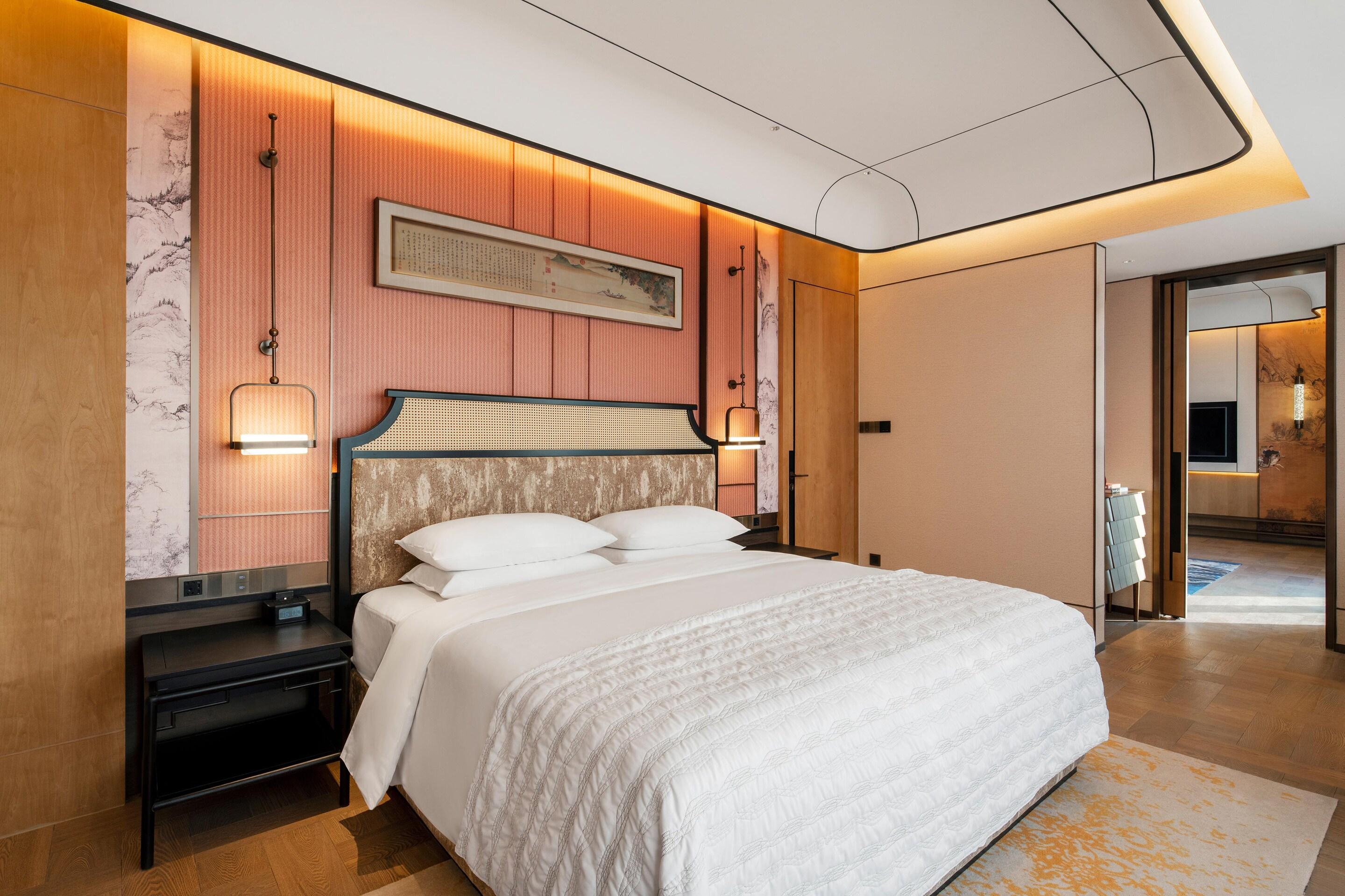 墻面懸掛的扇形山水田園畫引人遐想,時尚與典雅相結合。大面積落地窗將魔都夜景盡收眼底,是夢幻,是迷人。